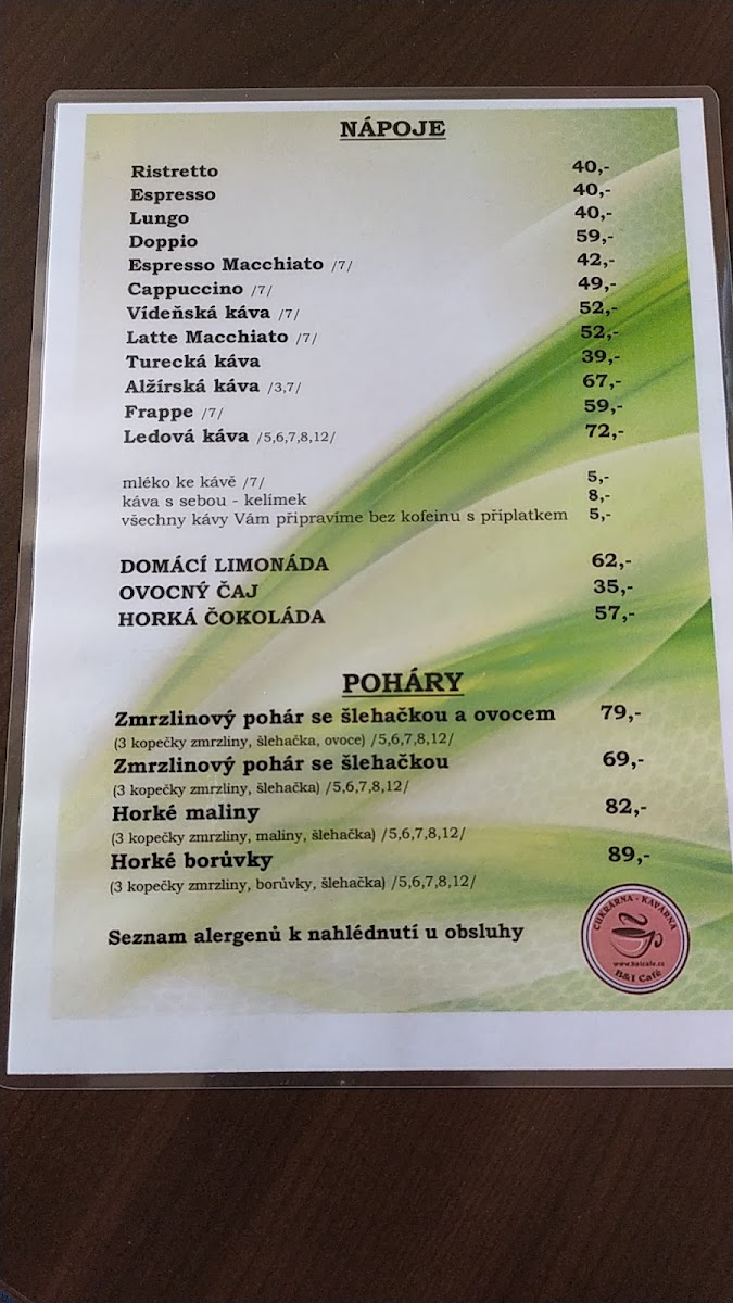 Cukrarna-kavarna B&I Cafe Menu